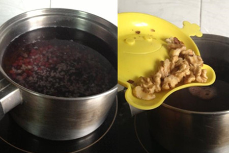 食材:黑米30克、糯米20克、红豆20克、薏米20克、核桃3个、水。