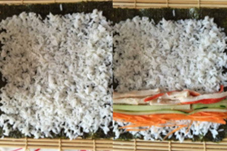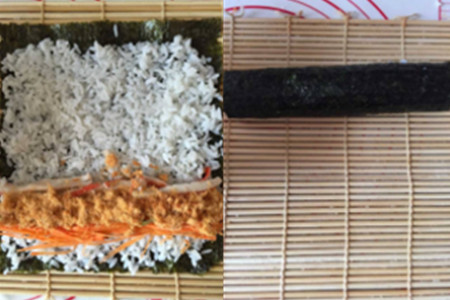 第四步,在米饭的一侧上,按顺序将胡萝卜丝、黄瓜丝以及蟹棒条摆放好,并把适量的肉松铺在它们的上面,接着把寿司帘卷起,定型后把寿司帘拿开。