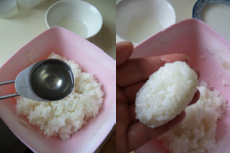 第四步,将调好的寿司醋浇在煮热的米饭上,将其搅拌均匀后,把适量的米饭捏成饭团形状,并在其上面放一片蛋皮,然后用紫菜条将两者捆绑在一起。