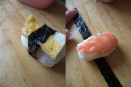 第五步,同样取少许的米饭,并将其捏成椭圆形,然后往其上铺一片三文鱼,同样用紫菜条将其捆绑在一起。