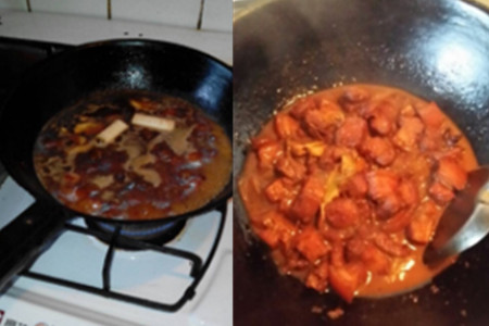 第一步,在锅中加入适量的油,油煮热后,加入适量的白糖,把白糖煮至焦糖色。