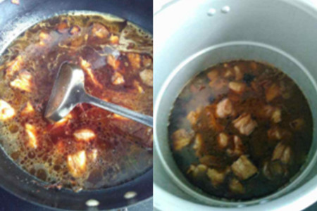 第五步,把煮好的食材全部转移到高压锅中,把五花肉压至口感软绵即可,用时大概15分钟。