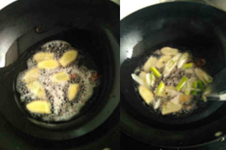 第二步,在干净无水的锅中倒入适量的油,加热以后,放入适量的花椒、八角以及姜片,用慢火将其翻炒,炒香后加入适量的白糖。