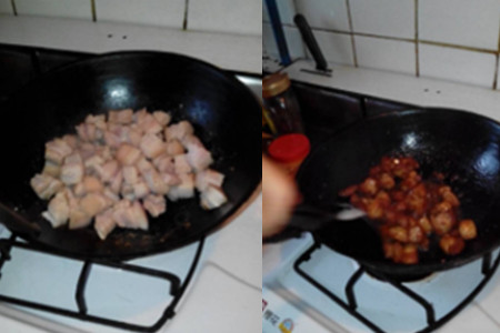 第二步,把洗干净切好的五花肉放入锅中,翻炒,使五花肉上色并出油。