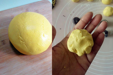 加入糯米粉和澄粉,把它揉成面团后放一旁待用,因为南瓜的水分很多,揉面时不用再加水了,按照南瓜的水分来填加糯米粉,注意不能太干,要湿软一些,不然在包馅的时候会裂开。