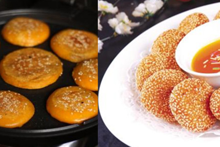 豆沙揉成球状,揪下一块南瓜糯米面团,揉成球后再用手按成圆形的小窝状,放进豆沙,然后像包汤圆一样收口再搓成球状,将球状的并压扁,两面撒上白色芝麻,用手多拍几下,这样就不会掉了。
