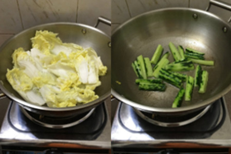 第三步,把锅烧热,倒入适量的食用油,把娃娃菜放入锅中炒,炒熟后放盐调味,盛出。把锅中剩余的油用来炒黄瓜,黄瓜炒熟后盛出,放在娃娃菜的上面。