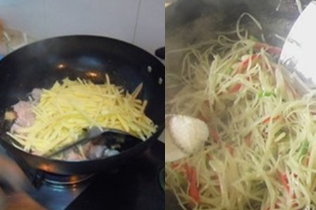 先热油锅,之后放入尖椒、红辣椒。个人认为先炒辣椒比较好,因为如果先炒土豆的话,到后来加入辣椒时,怕土豆太熟而断,则土豆就不成形了。辣椒炒至半熟后,倒入土豆丝,不断的翻炒,否则容易焦;