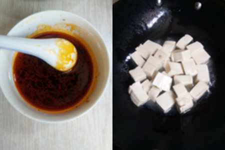 第三步,把油倒入干净的锅中,煮热,接着放入豆腐块,因为豆腐很快煮熟,而且很容易煮烂,所以,煮豆腐的时间不能过长,时间要拿捏好。