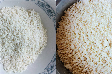 大约二十分钟左右水烧开,这一步骤是比较关键的,取适量的面放在一个比较大的容器里面,准备好一双筷子,把鸡蛋倒入白面中,用力搅拌,这个时候要注意把面疙瘩的大小。如果鸡蛋太多,那面疙瘩就会太黏,导致形成的面疙瘩太大,可以再加一些面,相反的,鸡蛋太少,面会太干,就需要加入一些水。面疙瘩的大小如图。