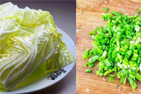 准备好食材,一碗白面,食用油,小葱,白菜,两个鸡蛋。小葱洗净切成比较小的段,白菜选择它的叶的部分,切成合适的大小。