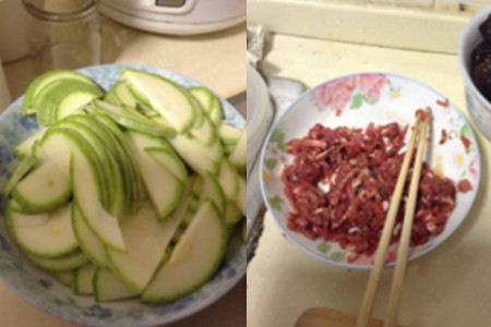 第一步,把西葫芦的皮用刀削去,切成半圆的片状;把买回来的瘦肉洗干净切成丝,装入空碗中,并往其中依次加入适量的料酒、生抽以及老抽,用筷子将其搅拌均匀,腌制一段时间。