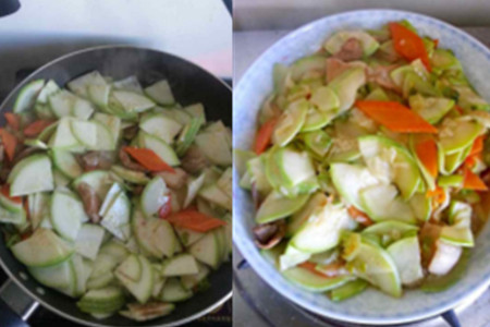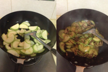 第三步,把事先切好的葱花放入热油锅中,爆香后,倒入西葫芦,翻炒几下后加入生抽和盐,把西葫芦炒软后即可倒入盛出来的瘦肉,一起翻炒,出锅享用。