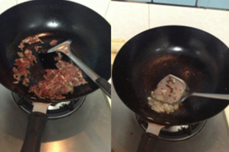 第二步,把锅加热,等到锅中没有多余的水分后倒入油,油煮热后倒入适量的瘦肉,炒熟后盛出备用。