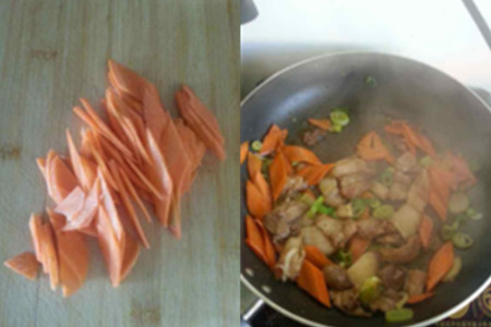 第三步,开火把锅预热,冒烟之后倒入油,油煮热后将切好的胡萝卜放入锅中翻炒,因为猪肉很快熟,所以等胡萝卜炒至七分熟后才将猪肉放入锅中翻炒。