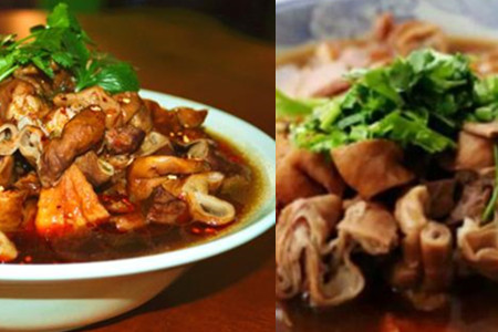 先把猪肺切成大块,冷水下锅先煮肠和肚,倒入些白酒去腥和葱姜,焯完肠和肚捞出来,放进猪肺,肺是浮在水面的不好煮,要多煮一会,水会很脏的,肺就干净了,捞出沥水。把炒好的下水切成小块,扎好调味料包。