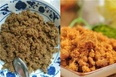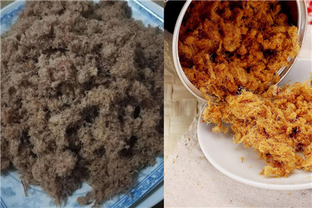 猪肉松的色泽是比较鲜明的,牛肉松是色泽偏暗淡,牛肉松的纹理纹路比较深,猪肉松纹路比较浅。它们的口感也有区别。猪肉松是比较软,入口即化,牛肉松则是口感比较细腻,有嚼劲,味道也是比较重一点。
