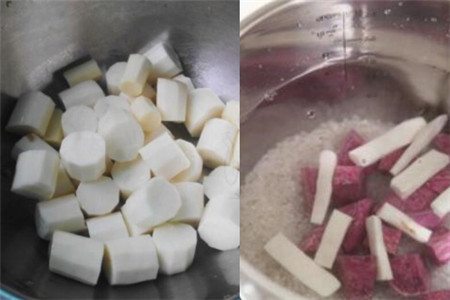 我们首先要把新鲜的紫薯洗干净之后削皮,然后把它切成块放在碗里面备用。山药可以不用准备太多,一点点山药就可以了。