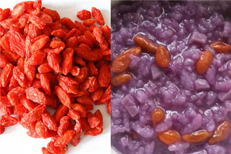 刚才教大家的紫薯山药粥只放了山药和紫薯,其实为了让我们的紫薯山药粥的功效更好一些,我们也可以多放一点其它的食材,比如说同样有着美容养颜功效的枸杞。如果我们是在夏天的时候熬制紫薯山药粥,那么我们就可以在煮粥的时候放一点枸杞。