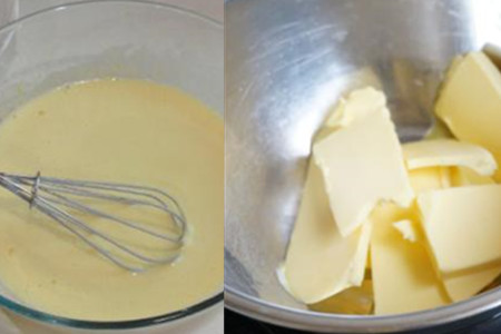 5、把黄油切一小块一小块,用微波炉进行低温加热,1分钟左右黄油就融化了。