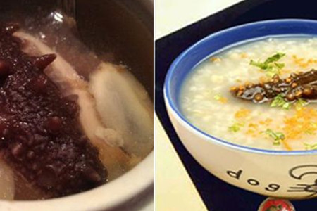将海参泡发后洗干净,将海参切成一小块一小块的。然后,我们把海参丁和大米一起拿去煮。趁热加入适量的冰糖,溶化后就可以了。