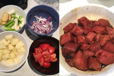 2.牛肉放凉后切成块状,放入适量生抽,老抽,料酒腌制二十分钟,放置待用。