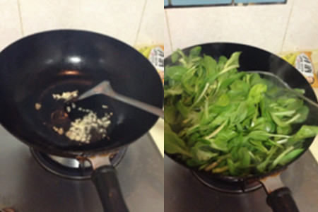 第三步,在锅中倒入食用油,把剁好的蒜末放入锅中爆香,接着把鸡毛菜放入锅中翻炒。