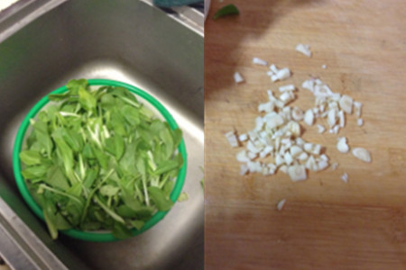 食材:鸡毛菜500克、蒜头5瓣、五香粉5克、盐5克、油15克。