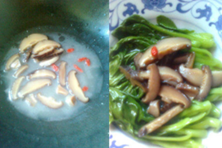 第四步,把锅中留有的水,倒去大部分,只留一点点,接着把香菇丝放入锅中,盖上锅盖,煮到可以闻到香菇的香味后就把枸杞放入锅中,再煮几分钟就把它们捞起,放到鸡毛菜上。