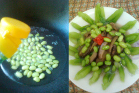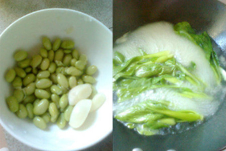 食材:鸡毛菜80克、毛豆80克、干香菇2朵、蒜头3瓣、盐5克、糖3克、油15克、熟猪油15克、枸杞3克。