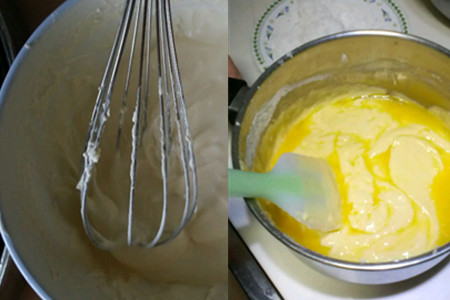 六、把三分之一的蛋白泡沫倒入之前搅拌好了的蛋黄液当中,用勺子用容器的底部忘上捞,如此循环往复一定的次数。搅拌得差不多了,就加入剩下的蛋白液之中,然后轻轻地把它们拌匀就可以了。