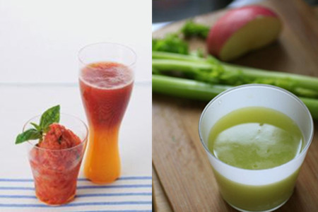 蔬果汁修整肠胃、代谢身体毒素的作用已经被大众认同,每天一杯蔬果汁,既可以补充人体所需的维生素,又达到了排毒、瘦身、养颜、降压等作用,养生就是这么简单。特别提醒您的是,蔬果汁中的蔬菜未经烹饪直接入口,为避免对身体造成影响,尽量选择有机、新鲜的应季蔬菜,清洗干净后削皮使用。