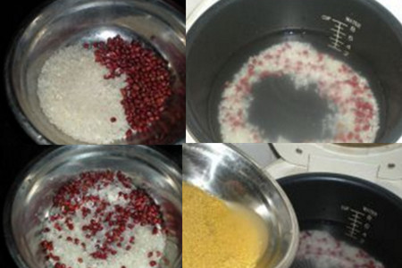 一、挑拣干净红豆里的杂物,加入大米一起用清水淘洗净。倒入电饭锅中,加适量的清水泡两三个小时。这是为了让红豆与小米更容易煮得烂糯,口感更好。