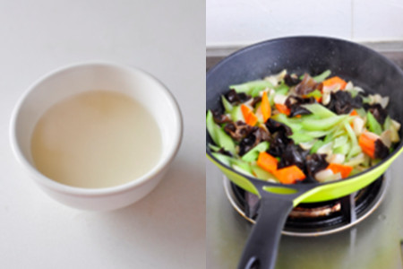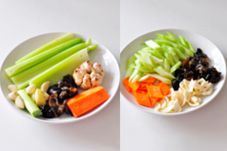 食材:西芹2根、百合1个、胡萝卜半根、木耳5朵、蒜头1个、葱1段、姜1块、高汤2汤匙。