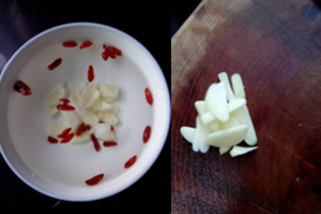 第一步,事先用清水浸泡干百合和枸杞;把西芹的叶子摘去,并用刀将其切成一小段一小段的;用清水将大蒜洗干净后将其切成一片片。
