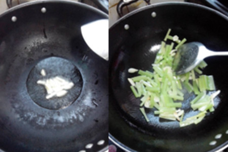第三步,在锅中放入一点点油,煮热后把切好的蒜片倒到锅中爆炒,飘出香味后将西芹倒入锅中翻炒,随后加入盐调味。
