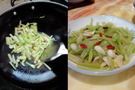 食材:西芹200克、干百合30克、大蒜10克、枸杞1小撮、调料粉5克、盐3克、油15克。