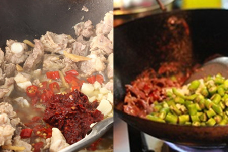 锅中加少许盐,一直将排骨炒到锅内的余油色泽清亮,加入泡椒、豆瓣酱、生抽和老抽翻炒均匀。泡椒和豆瓣酱中的盐分很多,为避免成品过咸,您视个人口味再加入适量盐和味精,炒到汁水收干就可以出锅了。