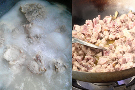 排骨用凉水浸泡一小时后倒掉血水,再浸泡一小时以后清洗干净。冷水下锅大火烧开之后,用炒勺撇去血水浮沫,捞出洗净备用。