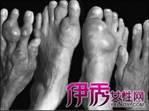 三、当血尿酸浓度过高时,尿酸即以钠盐的形式沉积在关节、软组织、软骨和肾脏中,引起组织的异物炎症反应成了引起痛风的祸根。如治疗不彻底可致关节肿大、畸形、僵硬、关节周围瘀斑、结节、并发痛风性肾结石、痛风性肾功能衰竭,痛风性冠心病、高血脂、高血压、泌尿系统结石等脏腑病症威胁患者的生命直致生命的终止。