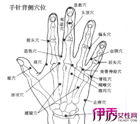 20.荨麻疹: 无名指肝穴、肺穴、小指肾穴、中指心穴、手背手腕阳池穴。