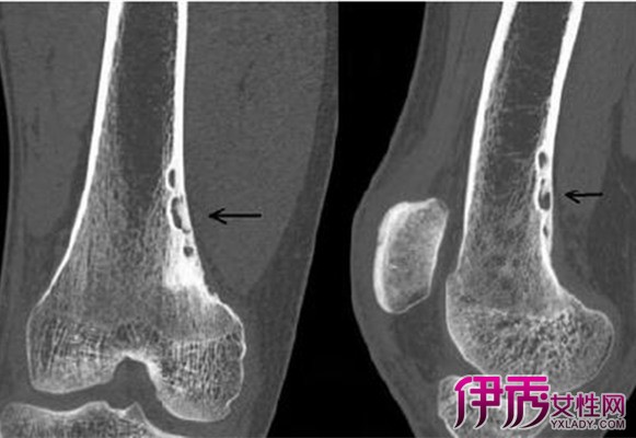 CT表现:皮质内囊状或不规则形、无膨胀性的骨质缺损区,边缘清楚,外侧骨壳可完整或缺损,邻近可有轻度软组织肿胀。无骨膜反应。MRI表现:病灶多呈中长t1和中短t2信号,周围骨硬化表现为低信号线样改变,病灶内的骨性间隔呈不规则的更低信号。增强扫描病灶边缘可有强化,提示有反应性充血区。1.干骺端结核:常发生于干骺端松质骨内,可跨越骺板。病灶内可有砂粒样死骨,密度不均匀,周围硬化范围不一,并逐渐移行于邻近疏松的骨质内。2.骨样骨瘤:位于干骺端皮质内者应与本病鉴别。前者多有明显局部疼痛和压痛。瘤巢内常见不均匀致密影,周围有广泛性骨质硬化和骨膜反应。3.邻皮质软骨瘤:局部骨皮质呈蝶形凹陷,周围伴明显骨质硬化,骨缺损两侧有三角形骨膜新生骨。有软组织肿块形成,其内可见斑点状钙化。
