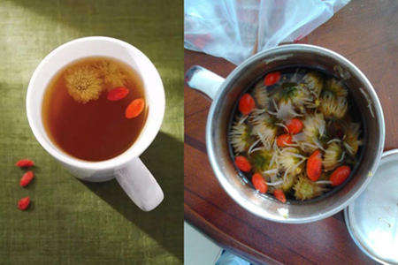 第一种是菊花枸杞茶,冲泡的方式很简单。选晒干的菊花五到六朵,枸杞同样是五到六颗,用煮沸的水泡好,静置四五分钟就可以喝了。因为菊性凉,能够起到清热的作用,还可以名目,消除肝火。而枸杞有补肾的作用,能润肺生津,并且活血益气。经常喝这两种东西泡的茶,能够滋阴补血,解毒清火,十分适合长期对着电脑工作的人,以及久坐的学生。