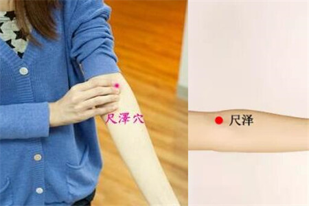 尺泽穴位于手臂上肱二头肌腱桡侧凹陷处也就是我们平常去医院抽血扎针部位附近。要是找不到,可以将手弯曲,就很好找出穴位。经常按摩这样帮助改善气喘,咽喉痛痒。穴位按摩手法是:将食指指腹按在该穴位上,逆时针揉动200下。