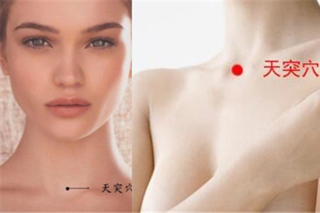 天突穴位于颈部,在锁骨正中间那个小窝内。对于慢性支气管炎引起的咳嗽,咽喉肿痛等呼吸道疾病有很好的治疗作用。按摩手法是:将食指放在该穴位上,用指腹顺时针按摩,每次按摩10分钟左右。注意力度适中,力度太大会伤到周围皮肤,力度太小则又见不到明显效过果。