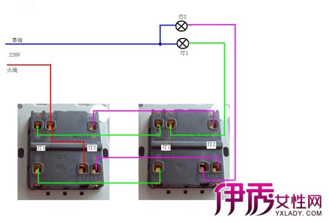 2、两个开关都入火线,而且只能接于上接线端(或者下接线端),这就使得灯亮时,两个开关的三个接线端对零线的测量电压都是220v,即试电笔都显示为红色。