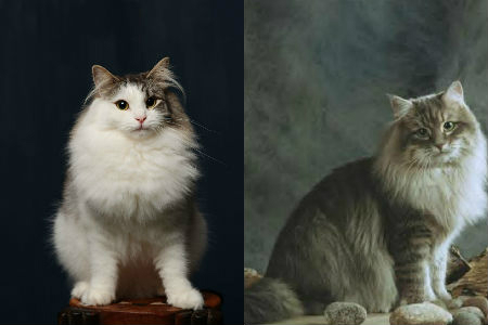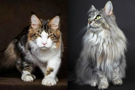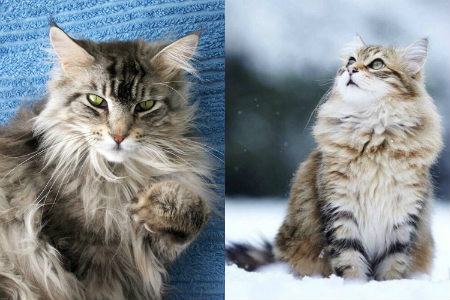 作为大型猫之一,缅因猫、西伯利亚猫和挪威森林猫这三种猫在外观上比较相像。缅因猫相较其他两种,体型更大,或者说是体长更长,而西伯利亚猫是体型最小的。缅因猫的尾巴非常长,但腿长垫底。挪威森林猫拥有修长结实的后腿,和与体长一致的尾巴。脸型可以参照上面图,左侧为挪威森林猫,三角脸,右侧为西伯利亚猫,圆脸。