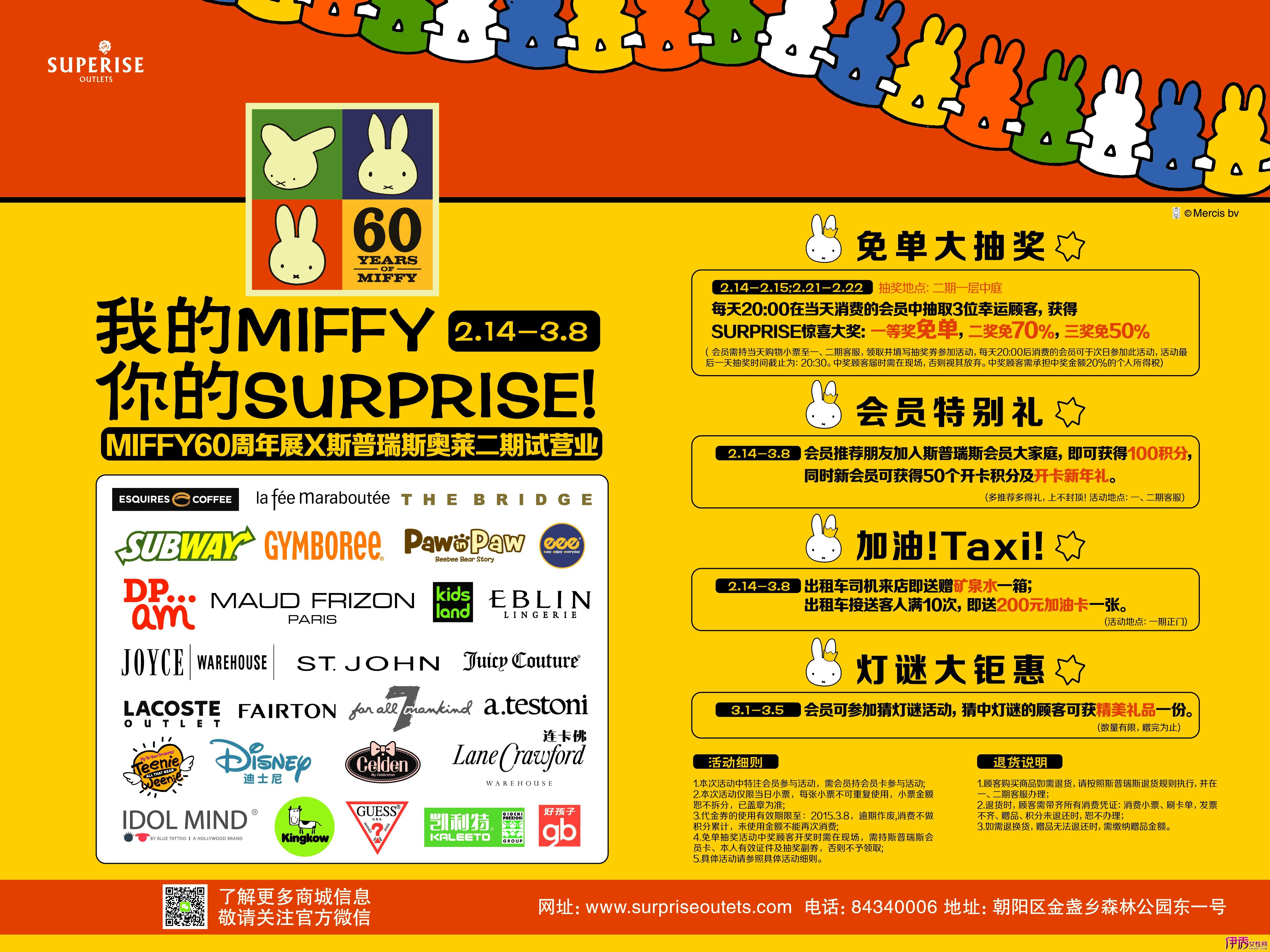 2月14日至3月8日期间,以"购时尚、惠生活"为理念的北京斯普瑞斯奥特莱斯商城与荷兰国宝级卡通人物——已有60岁高龄的Miffy兔跨界合作,携手举办“我的Miffy, 你的Surprise!——Miffy兔60年·斯普瑞斯奥莱二期试营业特别庆祝活动”!届时,所有Miffy兔的粉丝不但可以在斯普瑞斯奥莱商城与Miffy亲密接触,同时还可享受到试营业期间商城推出折扣钜惠活动,游乐购物欢乐到底!这个情人节,斯普瑞斯奥莱与Miffy一同陪你过!