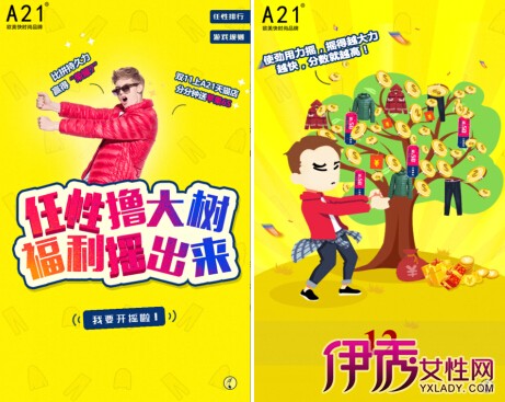 近年H5营销火速上位,层出不穷的创意借道这个风口一战成名。一向坚持“90后战略”的A21,敏锐地锁定了深受年轻人欢迎的H5游戏,大胆出位发起名为“任性撸大树,福利摇出来”的H5游戏。“摇一摇”源于微信,流行以来鲜有商家据此定制游戏,A21大胆将这一形式运用于互动游戏作软性推广,恰好踩中粉丝的兴奋点并触发深度互动。