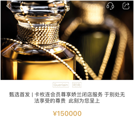 这场将每个细节都做到极致的法国娇兰全方位服务体验正是通过卡枚连线上甄选商城购买。花费15万元享受国际一线品牌法国娇兰至尊级闭店服务、定制主题派对,同时免费带走专柜价值15万的法国娇兰产品。等于是买够15万就可以获得顶级品牌的闭店和派对,除此服务外,法国娇兰顶级香水定制之旅也即将会在卡枚连甄选商城推出,定制全世界只属于你的专属味道。